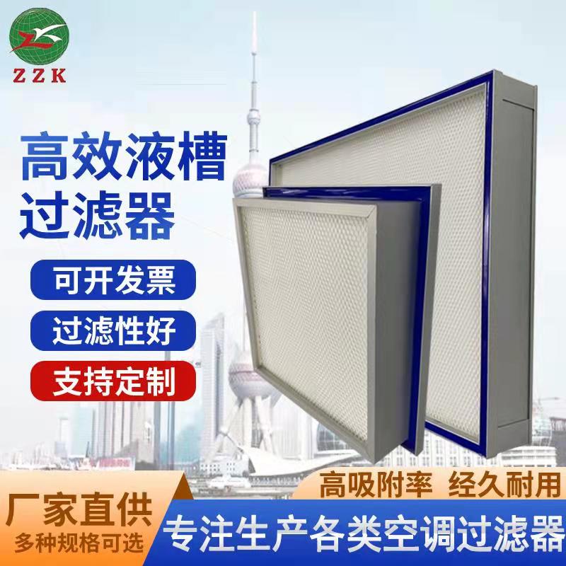 优点:密封性高,补漏性好。洁净厂房液槽式高效过滤器,无隔板做法,采用玻纤滤料,进出风面都有防护网,主要用于各种垂直送风的洁净厂房的高效过滤或终端过滤。