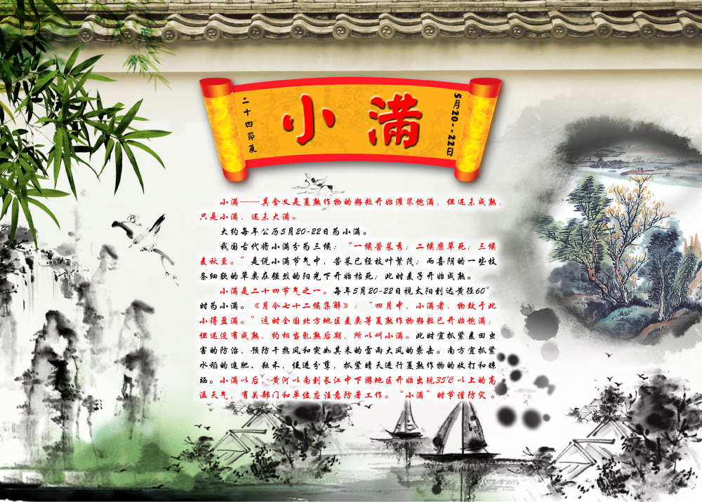 《月令七十二候集解》:“四月中,小满者,物致于此小得盈满。”这时全国北方地区麦类等夏熟作物籽粒已开始饱满,但还没有成熟,约相当乳熟后期,所以叫小满。