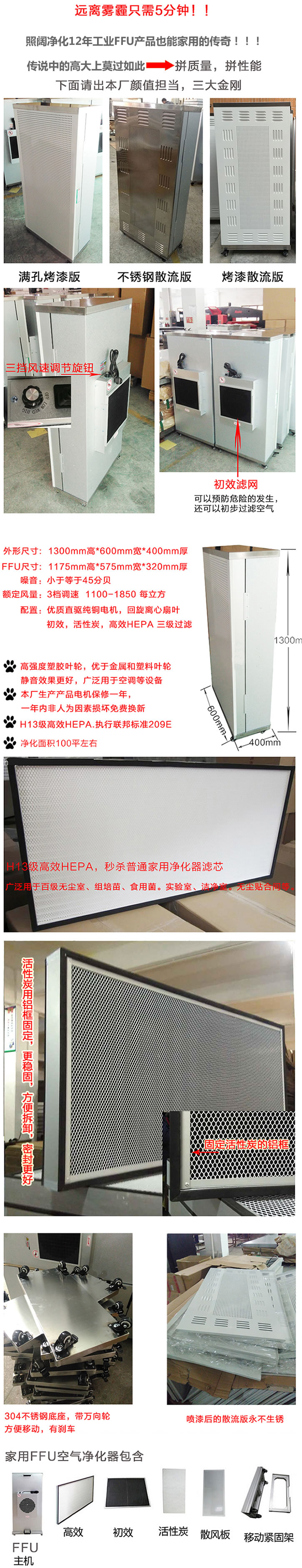 1、FFU材质,采用环保镀铝锌板,永不生锈,耐腐蚀,轻巧坚固,箱体采用黄金分割比例    点设计,美观大方,超薄机身节约空间,方便施工安装和日常维护。